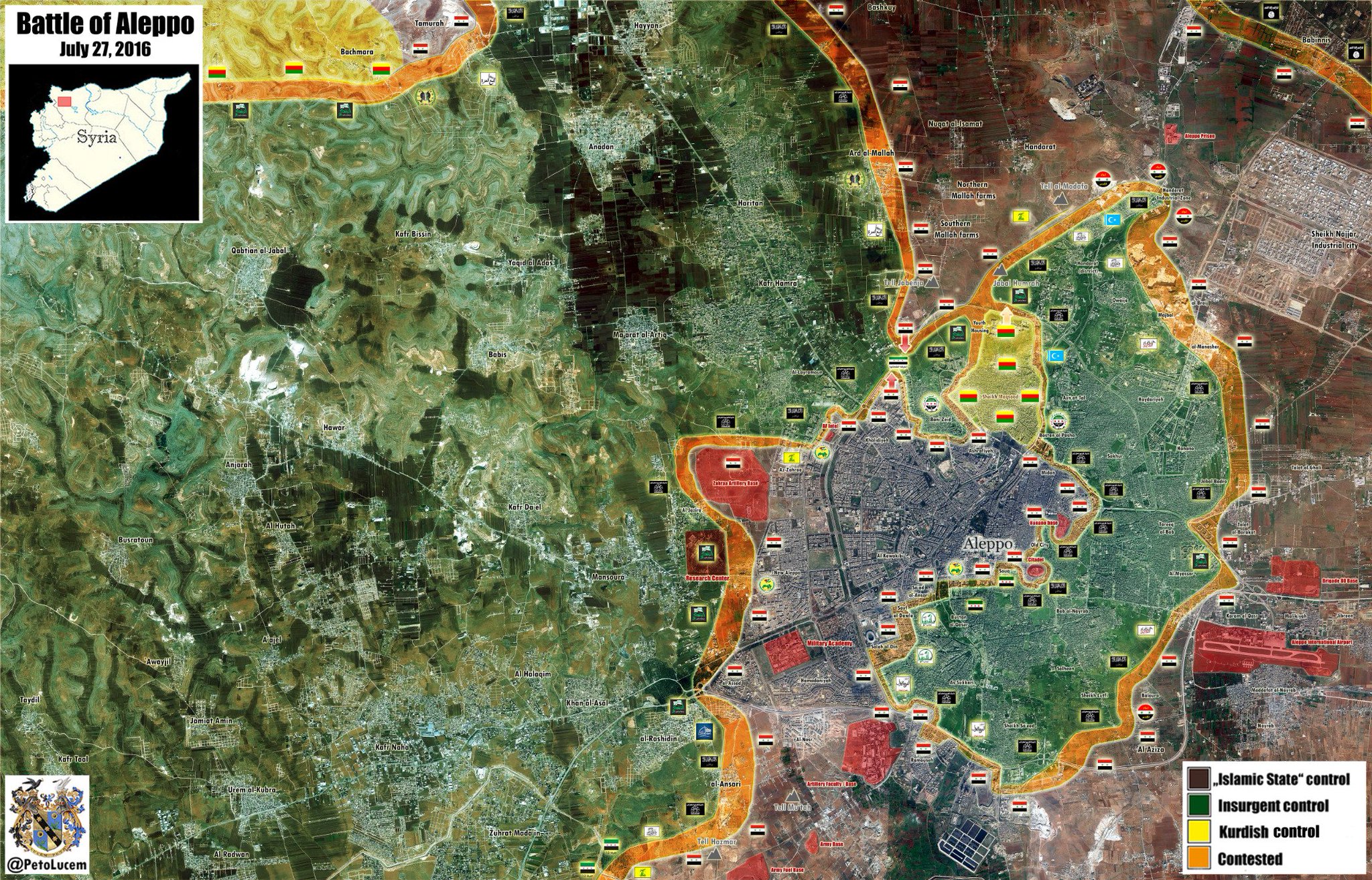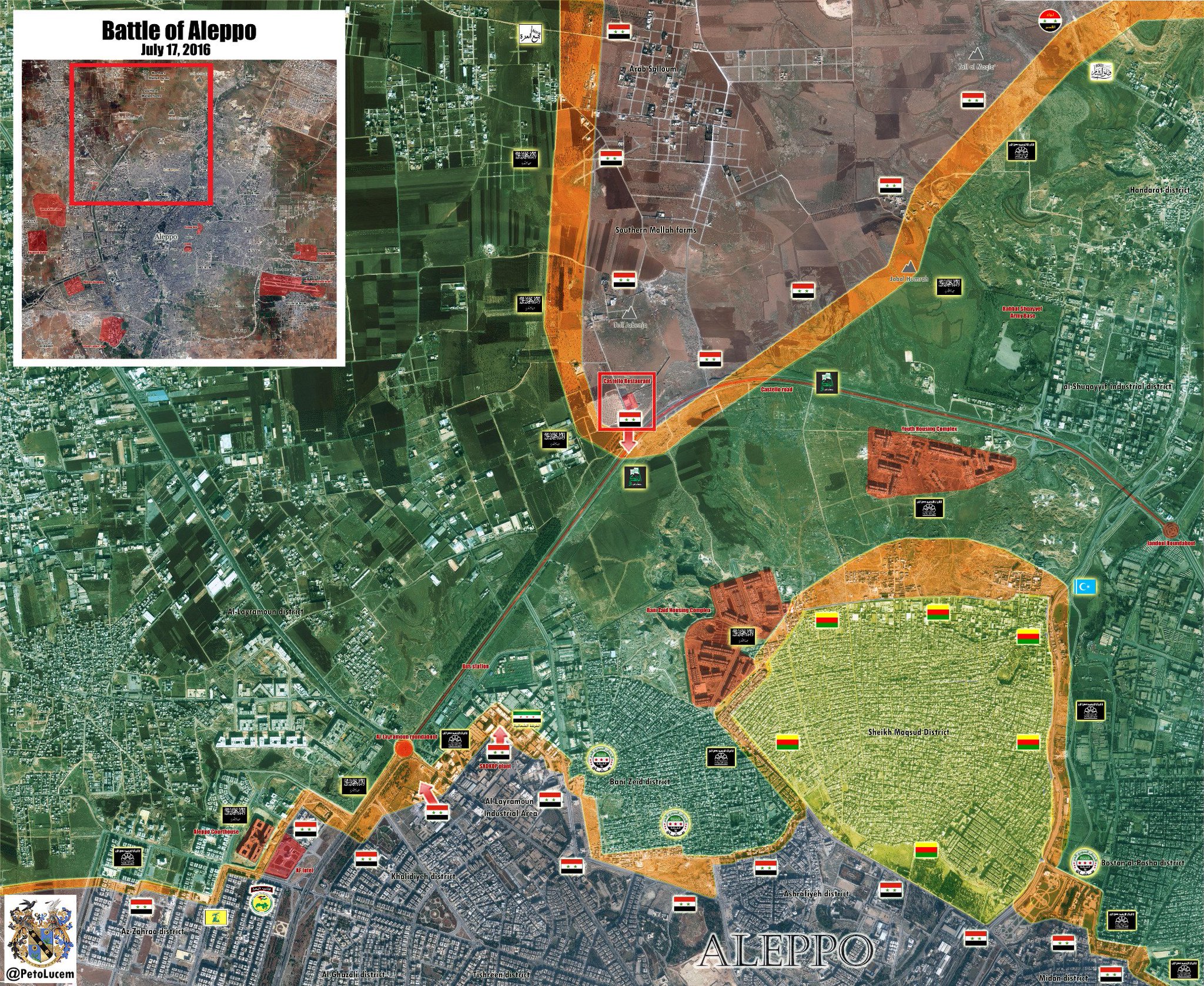 - Du 28 juillet 2016 âș Offensive loyaliste et kurde en vue d'effectuer une jonction complĂšte entre zones de Cheik Maqsoud et Youth housing (Kurdes), et les zones de Tell Jabenja, ZI de Al Layramoun et la derniĂšre zone conquise de Bani Zeid (loyalistes).