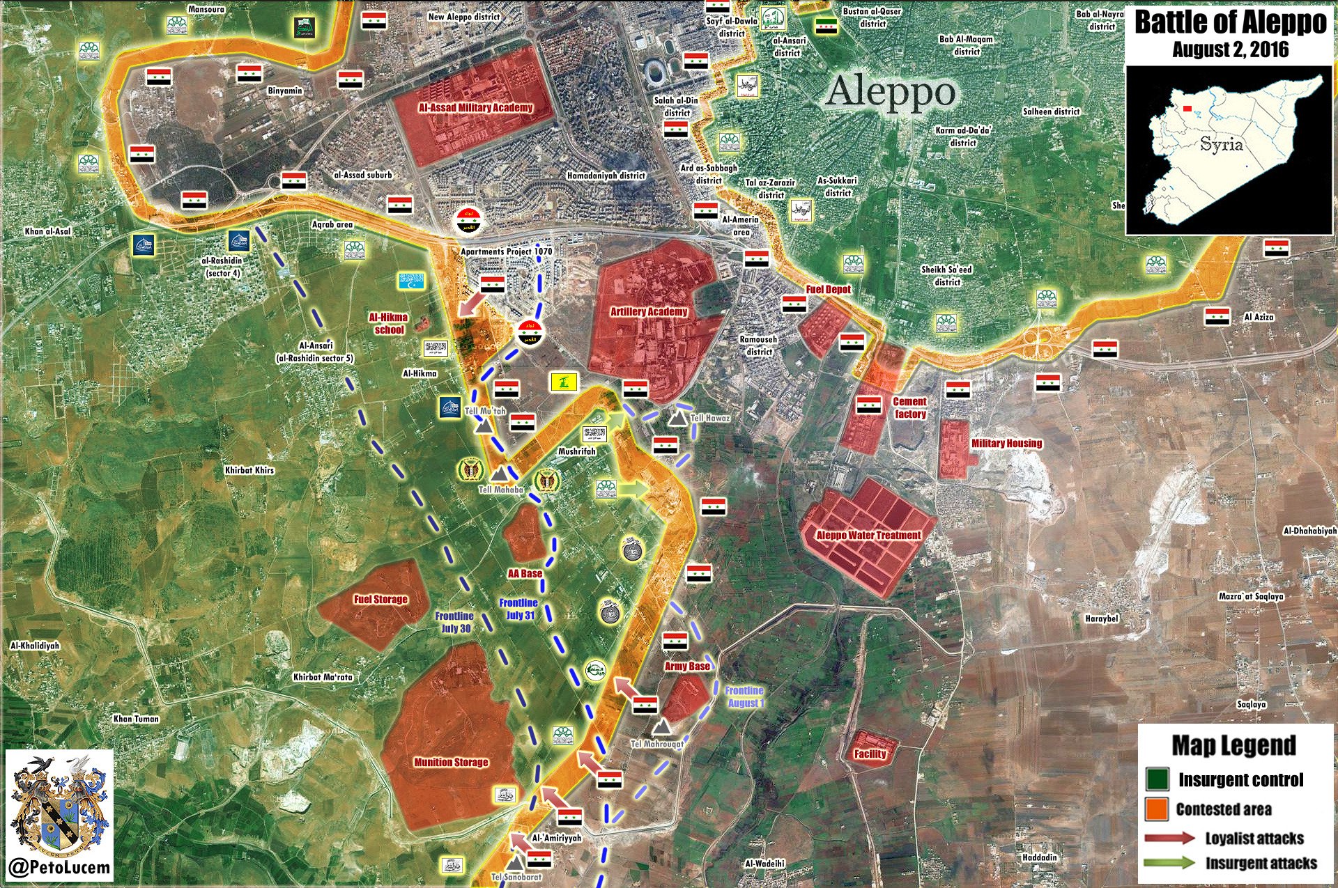 - Du 02 aoĂ»t 2016 âș Contre-offensive loyaliste Ă partir de la Base d'artillerie (au sud-ouest d'Alep) en direction de Al Ansari (avec visualisation des fronts du 31 juillet au 02 aoĂ»t).