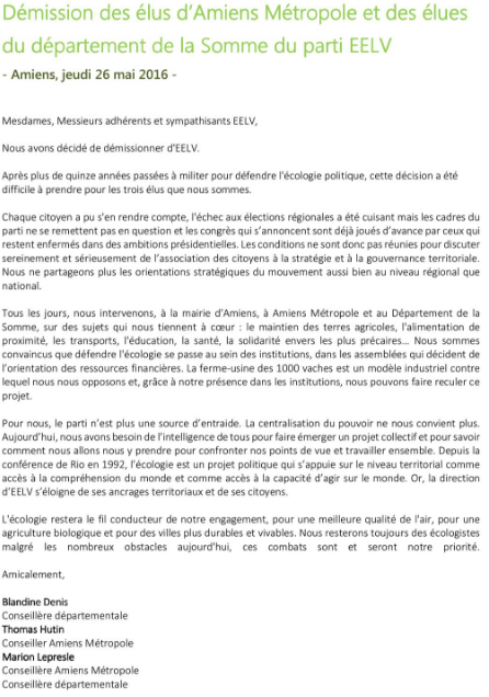 Marion LEPRESLE, élue en tant que membre d'EELV, a démissionné de son parti le 26 mai 2016, avec deux autres élus d'Amiens[4].