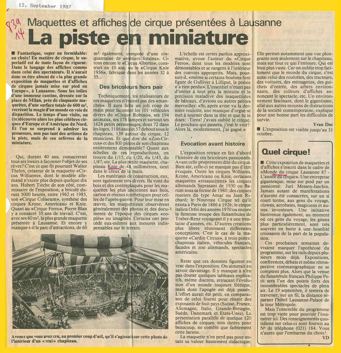 - article de 24 Heures Le Monde du Cirque Ă Lausanne 8.9.1986