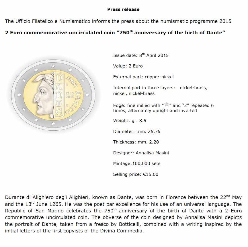 Press release : 2 Euro commemorative uncirculated coin "750th anniversary of the birth of Dante. Ufficio Filatelico e Numismatico. Disponible sur le site des Amis de l'euro.