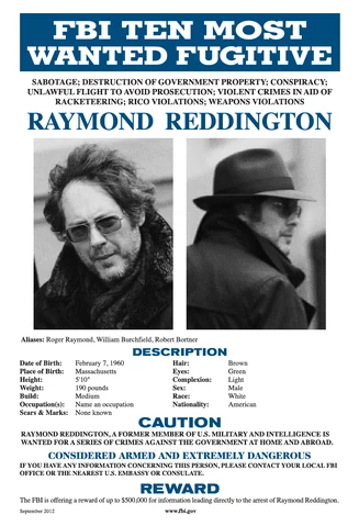 Après plus de vingt années de cavale, Reddington se rend au siège du FBI à Washington et se laisse interpeller après avoir demandé à parler exclusivement au directeur adjoint, Harold Cooper, en donnant son nom à l'accueil, ce qui donne aussitôt l'alerte et le place directement en garde à vue[9]. Après avoir eu confirmation de son identité et suspicieux concernant sa reddition, le FBI le déplace dans un site de détention secret (le "bureau de poste") où il est enfermé dans une cellule mécanisée élaborée[Note 1]. Il fait une offre aux fédéraux : l'arrestation d'un terroriste supposé mort, Ranko Zamani. Cependant, il émet une condition qui est de ne parler qu'avec Elizabeth Keen, jeune profileuse qui fait ses débuts au FBI, et pour laquelle il a un intérêt inexpliqué[9]. Lorsque cette dernière, ne comprenant pas le lien qui les unit, arrive au site pour le rencontrer et lui parler, ce dernier est ravi et lui parle comme s'il la connaissait, au point de l'appeler Lizzy. Ce dernier accepte de donner une information concernant Zamani : celui-ci projette d'enlever la fillette d'un général américain[10]. Après l'échec de la mission de protection de la fille, kidnappée par Zamani et ses sbires, le terroriste voulant se venger du général en faisant sauter une bombe à Washington en utilisant l'enfant comme support[10]. Connaissant le fabricant de l'explosif, Reddington exige que le FBI le laisse libre de ses mouvements et loger dans un hôtel luxueux.